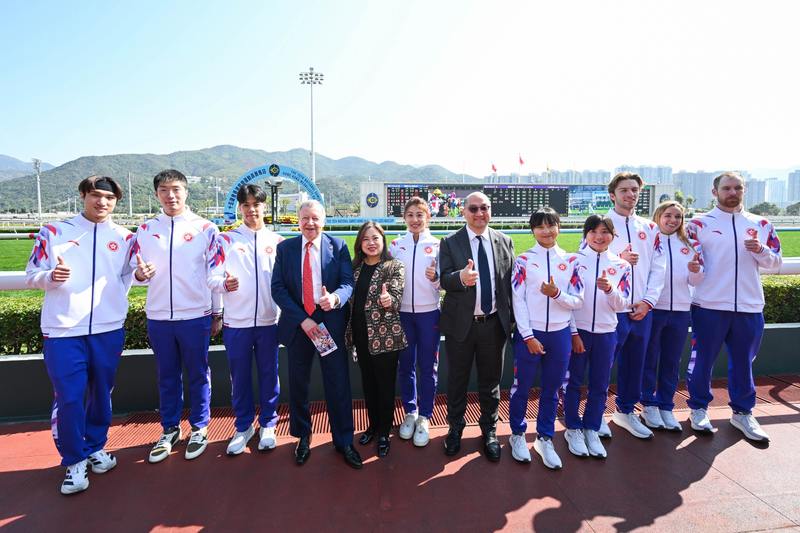 文化体育及旅游局局长罗淑佩(左五)、马会行政总裁应家柏 (左四)、马会公司事务推论总监谭志源(右六) 与一众港队畅通员一同观赏“十五运会香港奖牌畅通员杯”赛事。