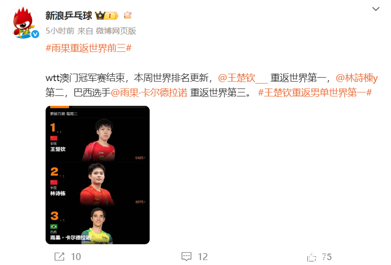 本次澳门冠军赛前的全国排行中,张本智和刚刚重返全国第三,他凭借在横滨冠军赛夺冠赢得的1000分,积分飙升至6000分,超过巴西的雨果重返全国第三,但是长此以往,跟着他在澳门冠军赛的首轮出局,以及巴西选手雨果在本次比赛中赢得亚军,全国排行再次发生变化;王楚钦凭借本站男单冠军,积分增多1000分,总积分达9425分,奏效超过林诗栋的9375分,时隔7个月重返全国第一,雨果则凭借亚军积分反超张本智和,重回全国第三,张本智和排行着落至第四
