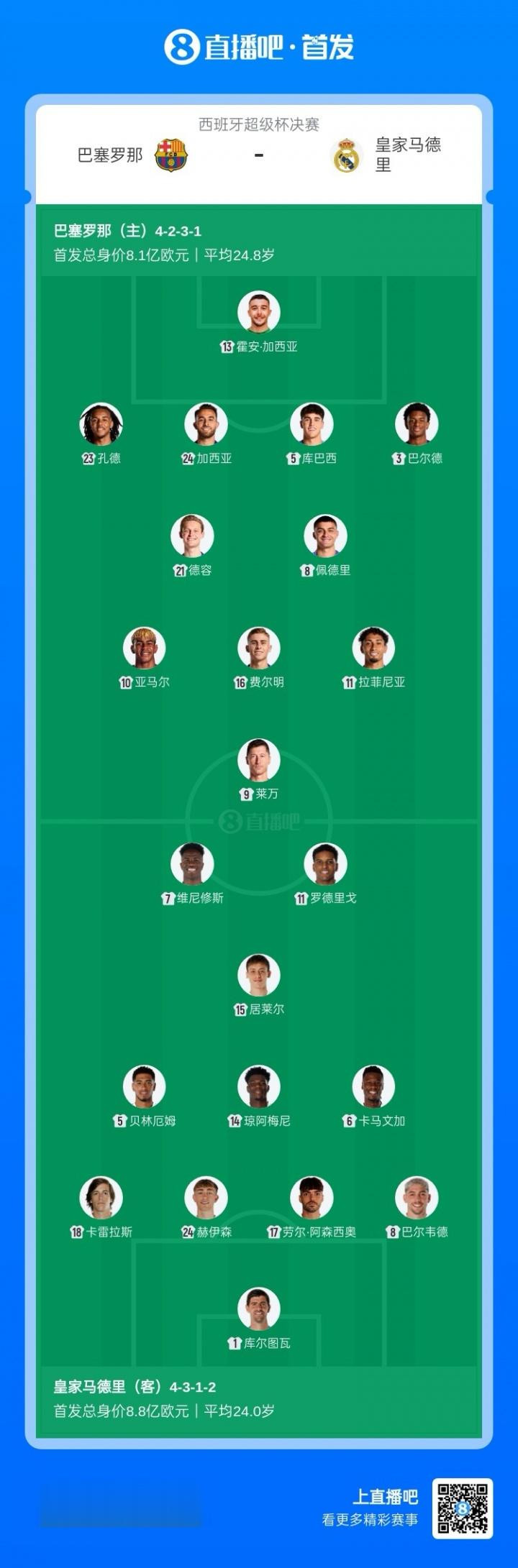 > 火星撞地球! 巴萨首发总身价8.1亿欧, 皇马首发8.8亿欧体育录像/图片