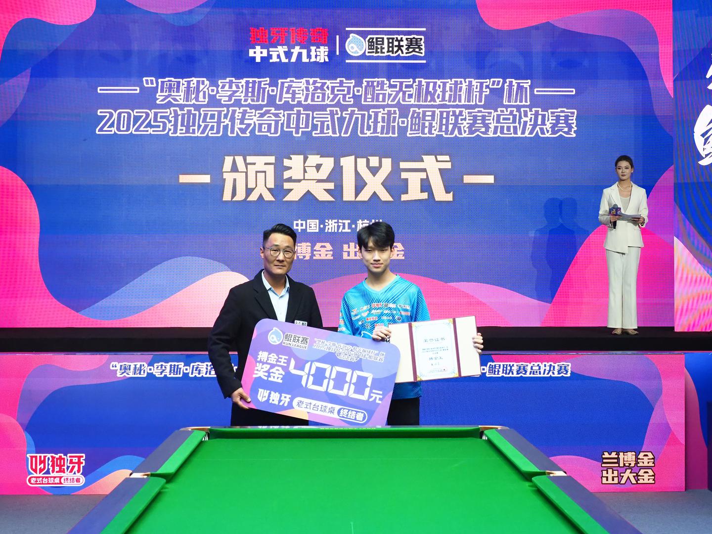 无人不晓,在登科九球中,打出大金、小金的一刹最能焚烧赛场心情。本次独牙传闻鲲联赛总决赛,特为正赛阶段打出大金、小金总和最多的选手诱惑“搏金奖”。最终蓝裕豪以43金的亮眼得益摘得 “搏金王” 盛誉!威海抓迈体育用品有限公司销售总监宋振华为其颁发4000元现款奖金及获奖文凭,这份荣誉,是对他超强焦灼本领与赛场拼搏精神的高度认同。