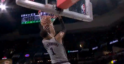 第三节比赛,文班亚马快攻无视防护背扣打成2+1,马刺逾越火箭至22分。